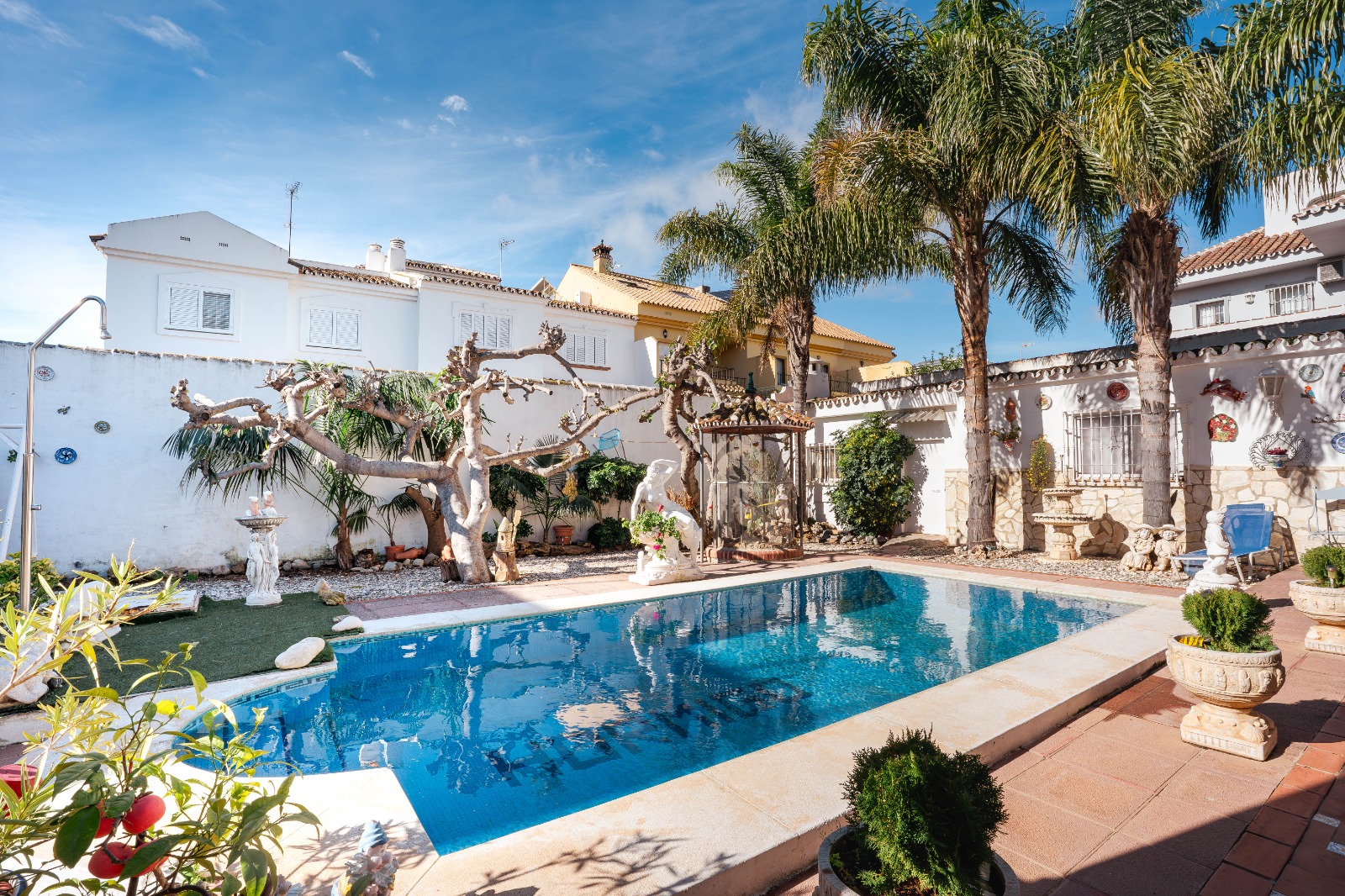 El exterior ofrece un jardín consolidado que rodea una piscina privada, creando un espacio ideal para disfrutar del clima de la Costa del Sol.